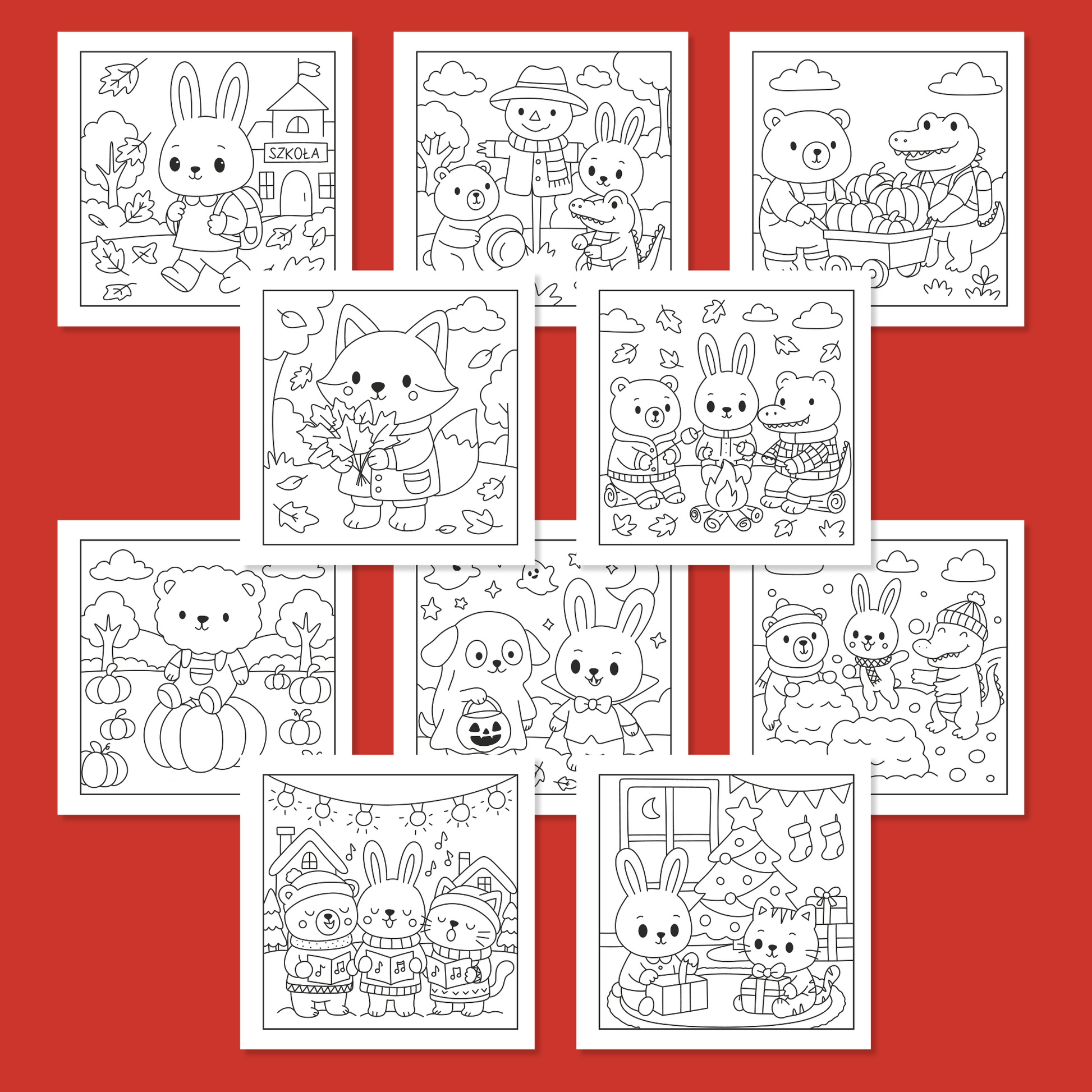 Jesień - Zima: Urocza i Relaksująca Kolorowanka to pełna ciepła, przytulna podróż przez najpiękniejsze chwile chłodniejszych miesięcy. Znajdziesz tu urocze zwierzątka, jesienne spacery wśród spadających liści, wieczory z herbatą i kocem, zabawy w Halloween, przygotowania do Świąt Bożego Narodzenia oraz zimowe scenki pełne radości i śniegu.